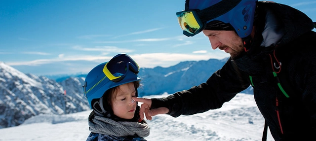 Neben individueller Hautverträglichkeit muss ein pistentaugliches Sonnenschutzmittel einen UV-B- und einen am EU-Siegel erkennbaren UV-A-Filter enthalten. Die LSF-Angabe bezieht sich auf den UV-B-Filter. Der UV-A-Filter ist stets etwas schwächer. Beim Eincremen ist Sparsamkeit fehl am Platz. Zwei Milligramm pro Quadratzentimeter Haut lautet die offizielle „Schmierempfehlung“. Für das Gesicht sollte es mindestens ein Teelöffel Creme sein, um den angegebenen Schutzfaktor zu erreichen. Prinzipiell sind Creme, Lotion und Spray gleich wirksam. Erfahrungsgemäß dosieren Sprayer jedoch oft zu niedrig. Noch ein Hinweis für die Damen: Sonnencreme immer vor anderen Kosmetika auftragen und einziehen lassen!